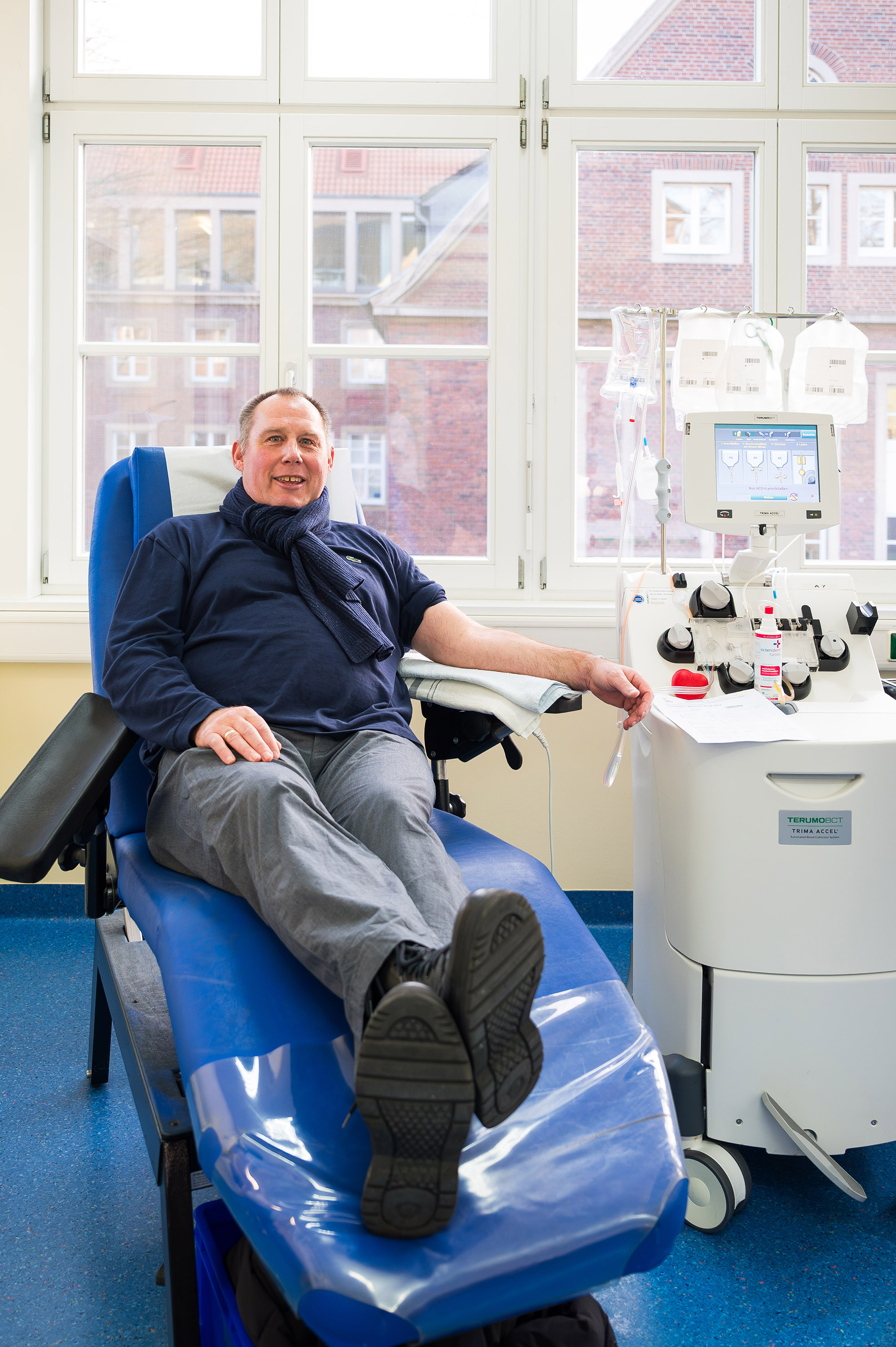 Für das Ehepaar Laukötter sei die Fahrt zur UKM Blutspende alle zwei Wochen „über die Jahre ein fester Termin in unserem Kalender geworden", sagt Markus Laukötter. Und das, obwohl die Thrombozytenspende – im Gegensatz zur normalen Blutspende – nicht nur einige Minuten, sondern über eine Stunde in Anspruch nimmt. Sie wird mithilfe einer Apheresemaschine durchgeführt, an die Spenderinnen und Spender über eine Armvene angeschlossen werden. Durch Zentrifugieren wird das Blut in Schichten aufgetrennt, sodass die Blutplättchen gezielt gesammelt werden können.